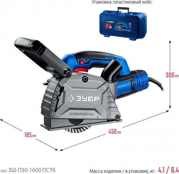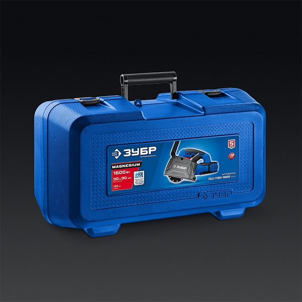 Штроборез Зубр Профессионал ЗШ-П30-1600 ПСТК (Zubr Professional ZSH-P30-1600 PSTK) – профессиональный инструмент с мощным двигателем для выполнения штроб глубиной до 30 мм и шириной 3 – 30 мм в кирпиче и легких бетонах. Оснащен всеми современными электронными системами (плавный пуск, константная электроника, защита от перегрузки) для безопасности и большей производительности. Полная пылезащита всех узлов и комплектующие высокого класса гарантируют надежность. Расширенная (по сравнению с ЗШ-П30-1600 ПСТ) комплектация включает удобный кейс для хранения и переноски. Легкость и компактность позволяют длительно держать его на весу при работе на вертикальных поверхностях.